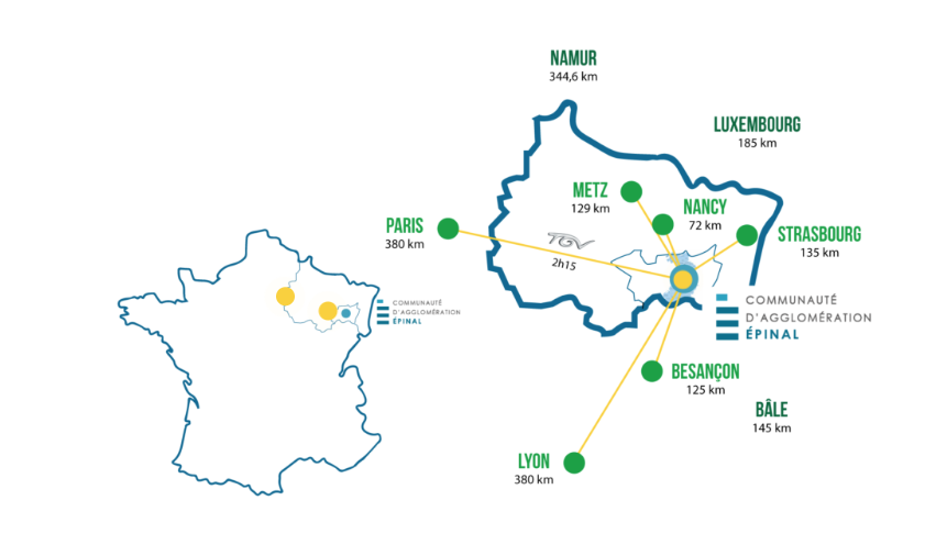 Au sud de la Lorraine, à proximité de la Belgique, du Luxembourg, de l’Allemagne et de la Suisse, Épinal bénéficie d’une situation privilégiée au cœur de l’Europe.