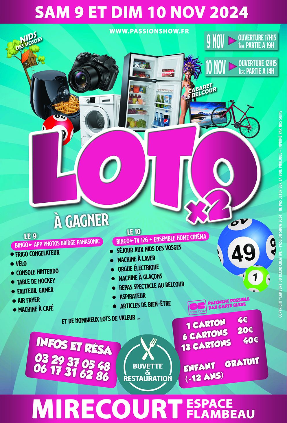 Passion Show organise 2 super Lotos dont les bénéfices seront entièrement investis dans la 8ème édition du GRAND-SHOW – SPECTACLE DE VARIÉTÉS ET SCÈNE OUVERTE le samedi 31 mai 2025 à Mirecourt.