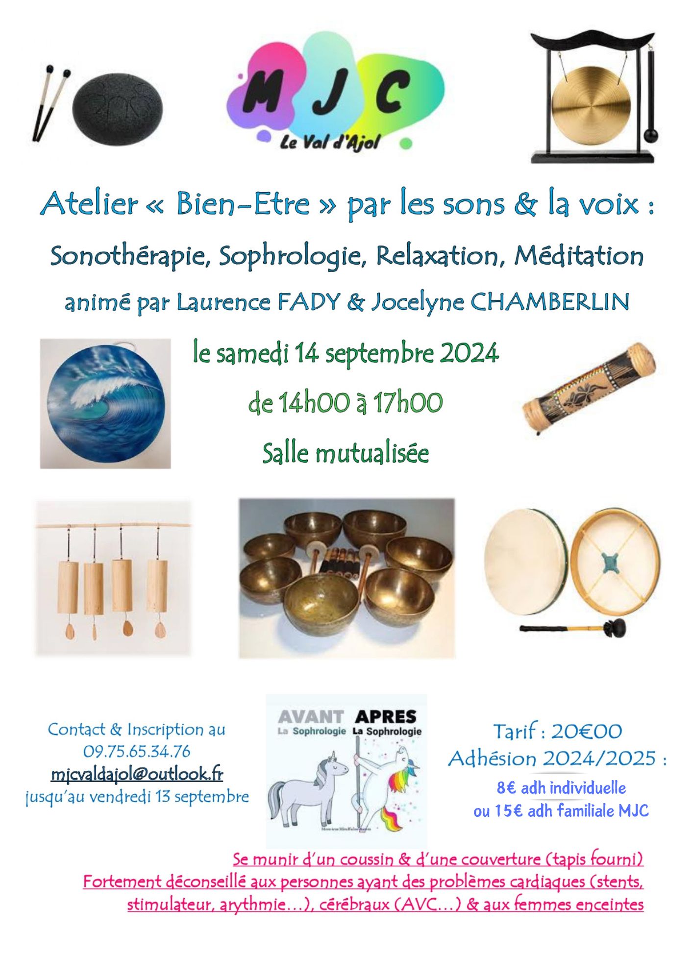 Atelier bien être, la MJC du Val d’Ajol, Laurence et Jocelyne, vous proposent un stage bien être le samedi 14 septembre 2024, de 14h00 à 17h00, salle mutualisée (bâtiment Espace Arts et Culture)