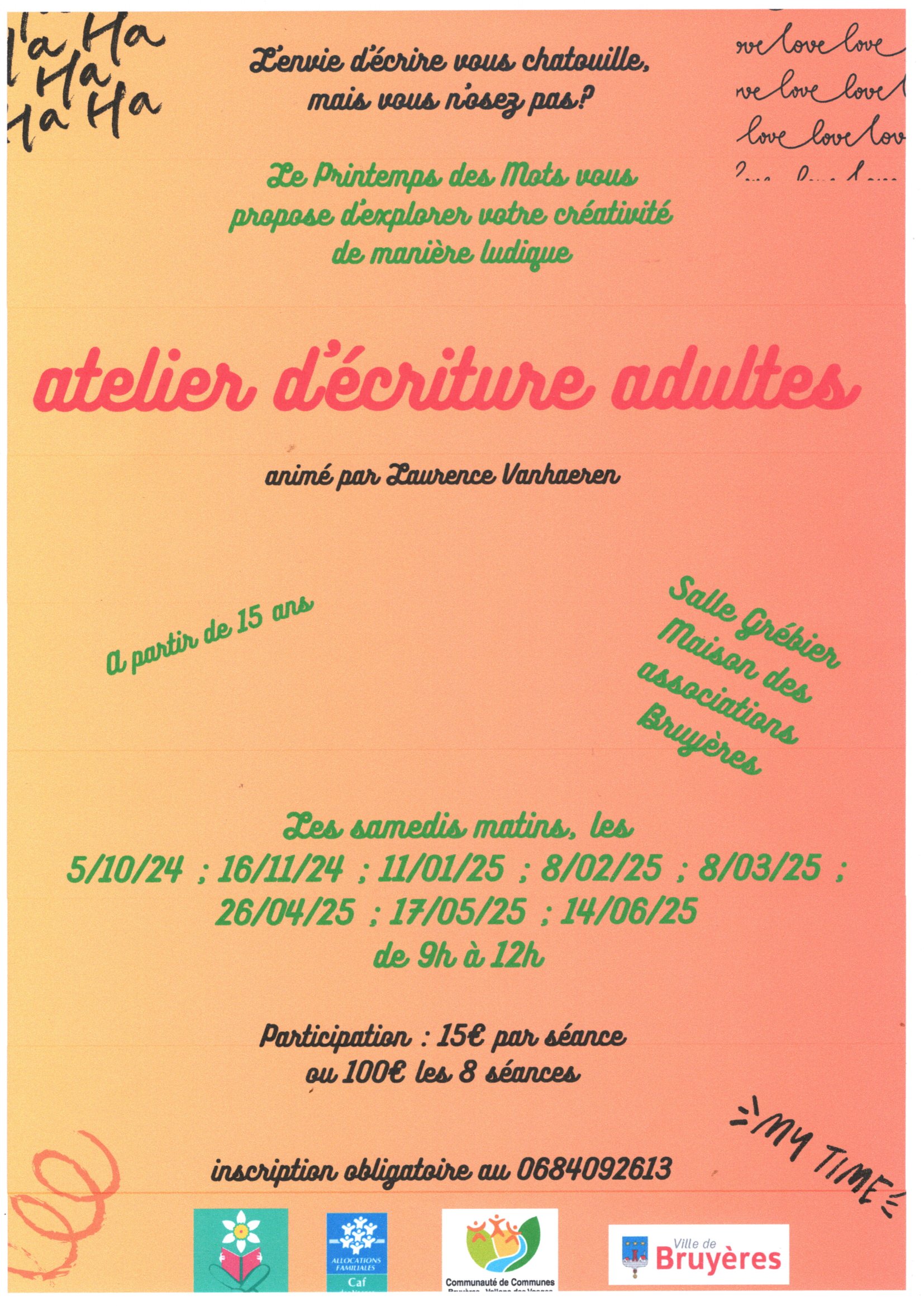 Ateliers d’écriture adultes proposés à Bruyères certains samedis matin.