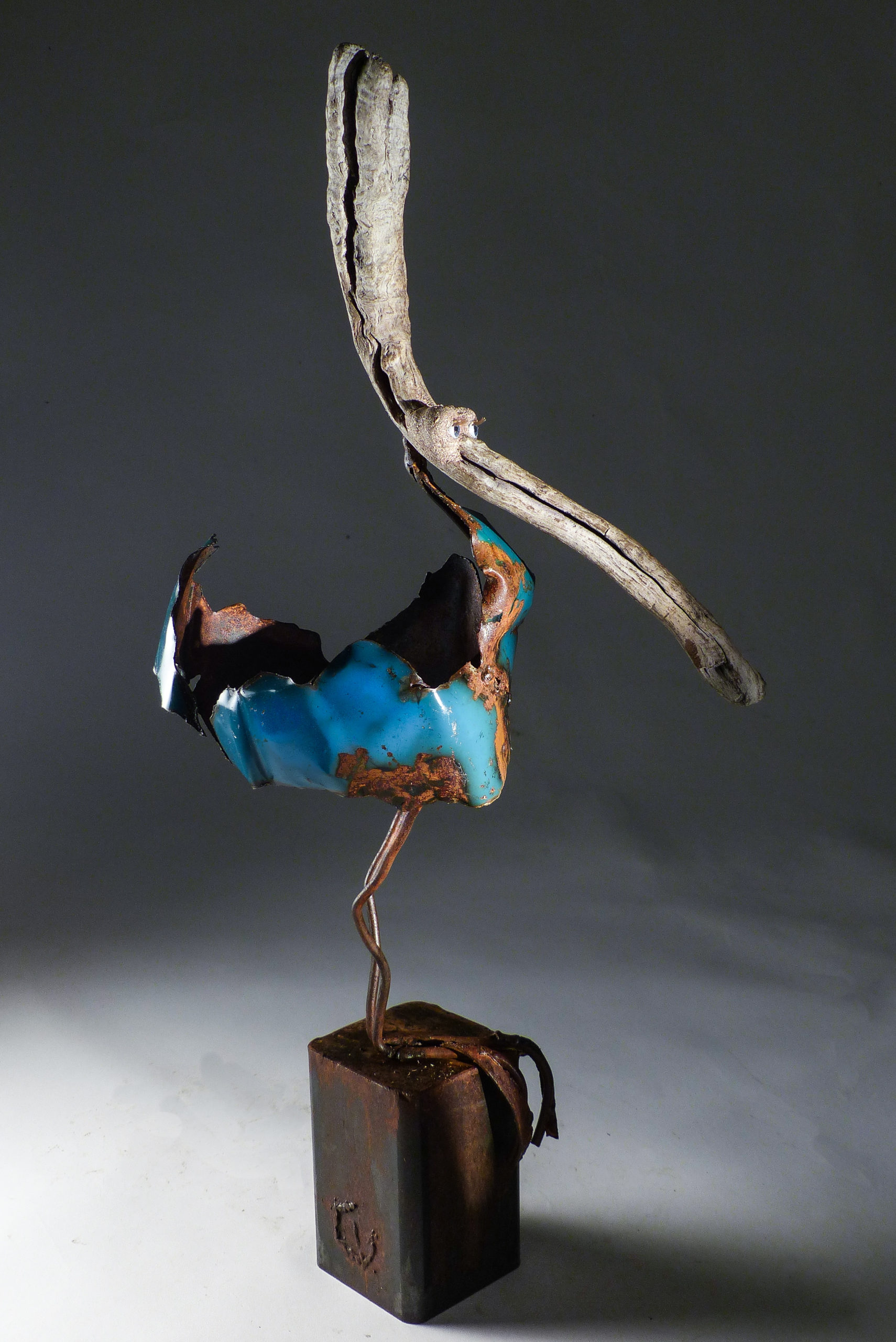 Des fragments de matériaux trouvent leur place dans la création d’oiseaux métalliques. Les débris (extincteurs, bidons, bois…) s’unissent et se forment en un Tout. Sans se substituer à une réalité existante, mais juste en l’effleurant comme une esquisse ; Valérie Cerutti recherche l’équilibre dans ces matériaux et leurs formes d’où s’élèvera une silhouette graphique. Chaque sculpture éveille une émotion singulière grâce à des caractères propres, un regard doux, une posture majestueuse ou une subtile instabilité dans sa position. Une douceur irréelle, qui intrigue, émane de ses oiseaux.