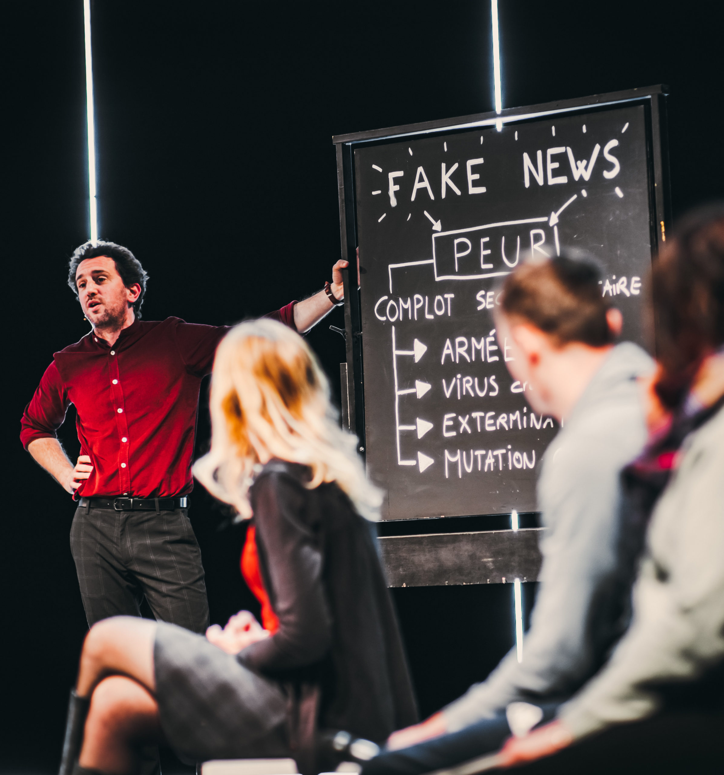 Avec ce nouveau projet, la Cie du Faro questionne ce qui fonde la véracité d’une information : comment créer une impression de vérité et ainsi partager de fausses informations ? Comment piéger l’esprit critique du spectateur ? Géométrie Variable déploiera des mécanismes similaires à ceux à l’œuvre dans les fake news afin de questionner le public et d’éveiller la conscience du doute et du libre-arbitre.