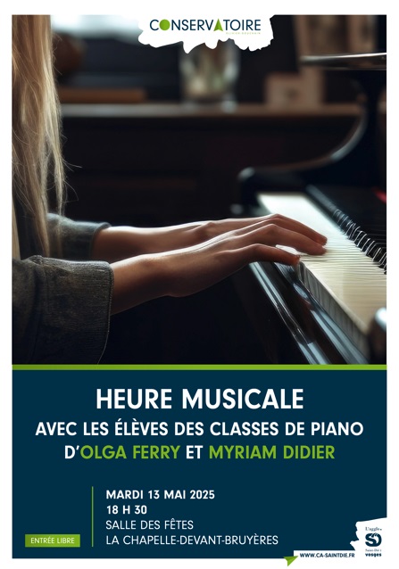 Le Conservatoire vous propose de passer une Heure Musicale en compagnie des élèves des classes de piano d’Olga Ferry et Myriam Didier, 18h30, salle des fêtes de La Chapelle-devant-Bruyères, entrée libre