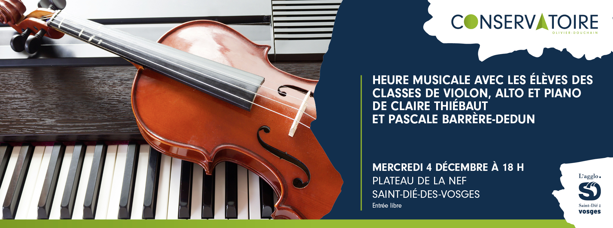 Le Conservatoire vous propose une heure musicale avec les élèves des classes de violon, alto et piano de Claie Thiébaut et Pascale Barrère-Dedun, 18h, plateau de la Nef, entrée libre