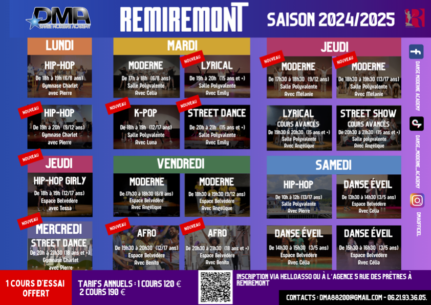Nous avons le plaisir de vous dévoiler le planning des cours pour la saison 2024-2025, qui marque la 15ème année d’existence de la Danse Moderne Academy ! ????