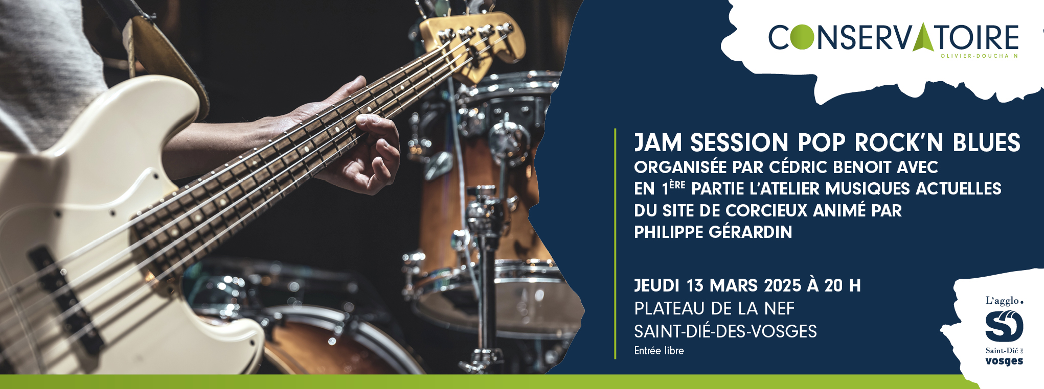 Jam session pop rock’n blues proposée par Cédric Benoit avec en 1ère partie l’atelier musiques actuelles du site de Corcieux de Philippe Gérardin, 20h, plateau de la Nef, entrée libre (élèves ou pas, amateurs, pros, venez partager la scène et la musique) !