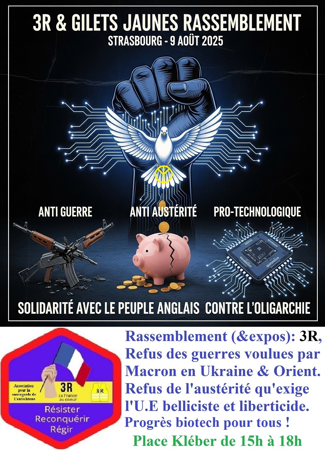Événement en accès libre. Organisateur : Association 3R afin de Résister, Reconquérir, Régir pour obtenir Paix, Démocratie, Progrès. 3R promeut le RIC (Référendum d’Initiative Citoyenne) suite au combat Gilet-Jaune de 2018 et comme association (de type loi 1908) depuis 2022. Nous regroupons des anciens GJ & des partisans de la paix.