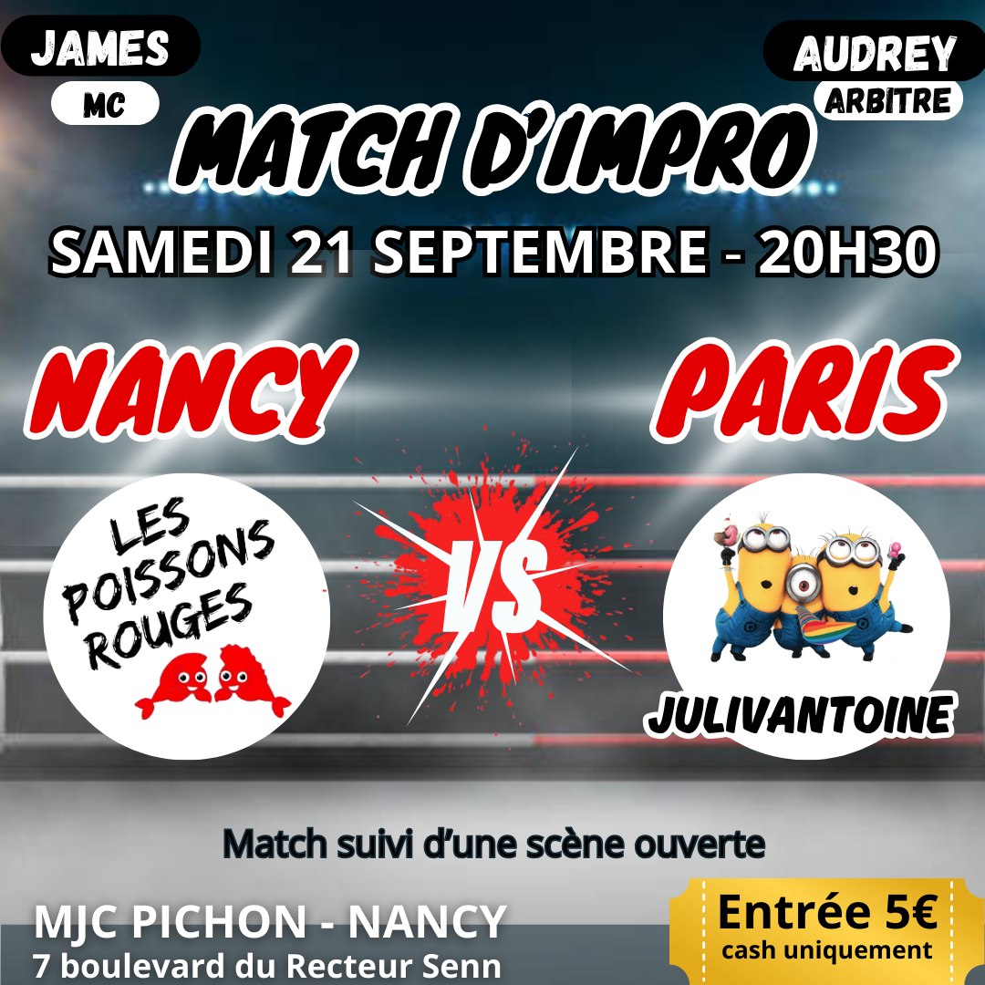 La troupe de théâtre d’improvisation Les Poissons Rouges présente son prochain spectacle à la MJC Pichon, le match Nancy-Paris suivi d’une Jam session.
