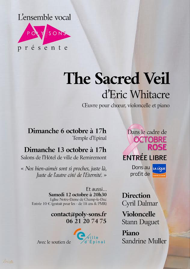 The Sacred Veil de Eric Whitacre , une œuvre pour choeur , violoncelle et piano tour à tour joyeuse , poignante , angoissée , résignée , universelle , fruit de l’amitié entre Charles Silvestri et Eric Whitacre décrit la force de la tragédie et la puissance de l’amour .