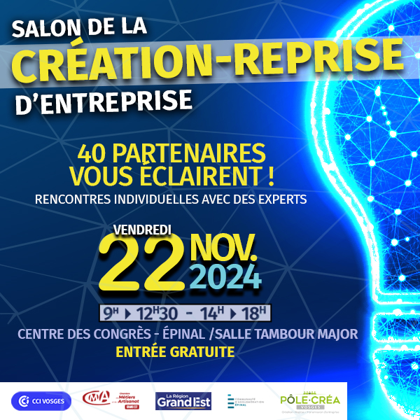 La Chambre de Commerce et d’Industrie des Vosges, la Chambre de Métiers et de l’Artisanat Grand Est – établissement des Vosges, ainsi que le Pôle CRÉA, organisent le salon de la Création-Reprise d’Entreprise destiné à faciliter les démarches des porteurs de projet, le vendredi 22 novembre prochain au Centre des Congrès d’Epinal (salle Tambour Major).