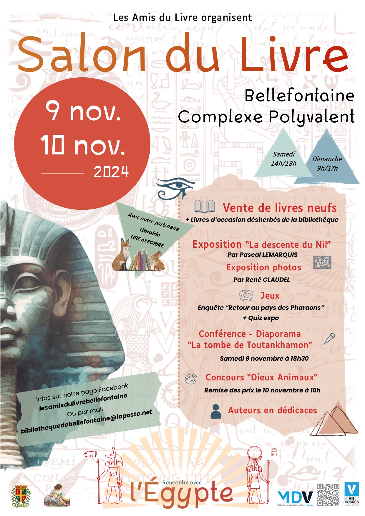 Week-end autour des livres avec vente de livres neufs, présence d’auteurs locaux en dédicaces, expositions : photos par René Claudel, « La descente du Nil » par Pascal Lemarquis, Jeux : Quiz expo et exposition enquête « Retour au pays des pharaons », conférence, stand de livres d’occasion.
