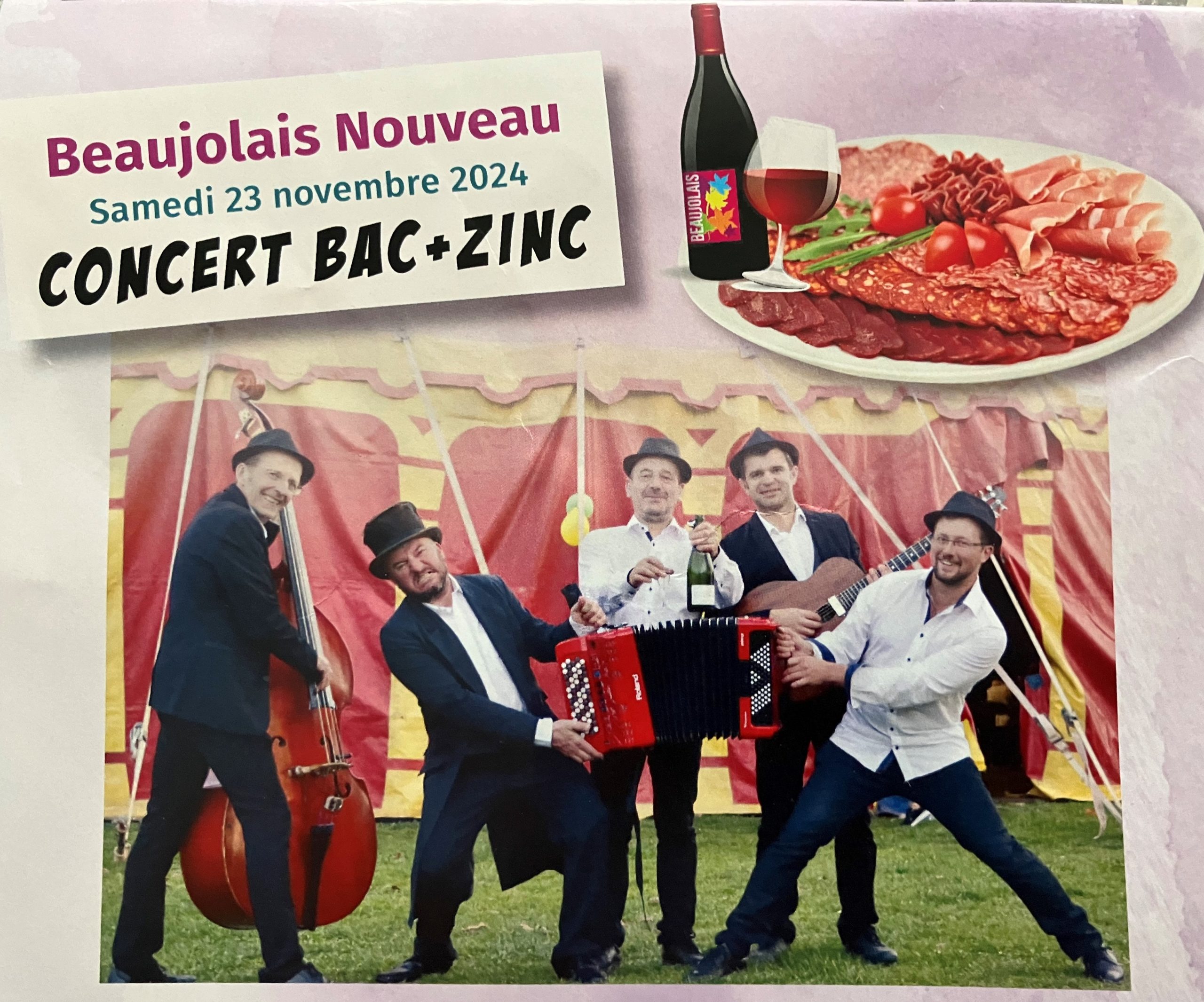 On fêtera, avec modération, bien sûr, l’arrivée du beaujolais nouveau à la salle polyvalente de Aumontzey, avec le groupe Bac + Zinc. Entrée fixée à 15€, avec assiette de cochonailles et tarte. Les boissons ne sont pas incluses. Nombre de places limité à 120.