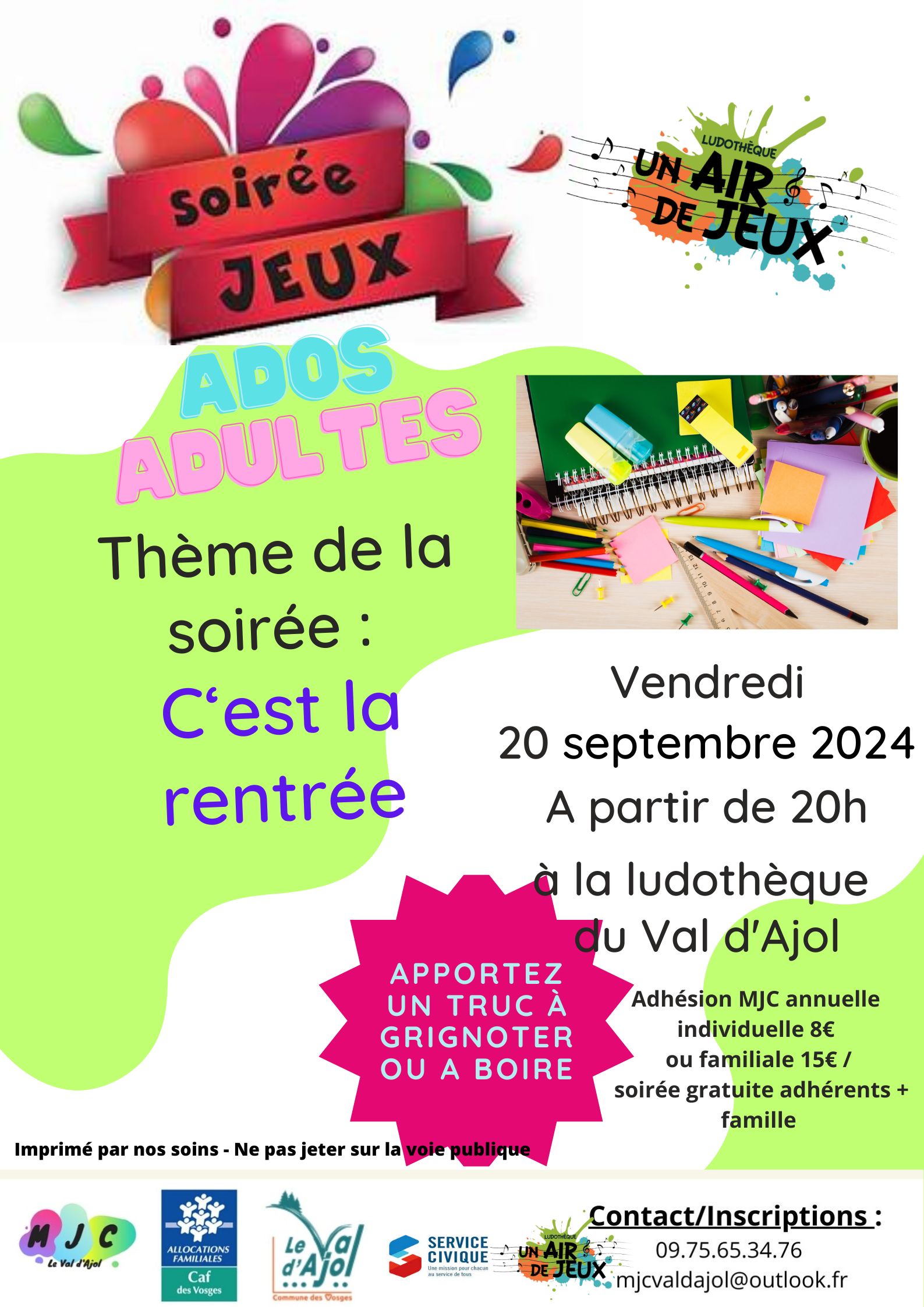 Alors venez nous retrouver à la ludothèque « Un Air de Jeux » de la MJC du Val d’Ajol le vendredi 20 septembre 2024 à partir de 20h.