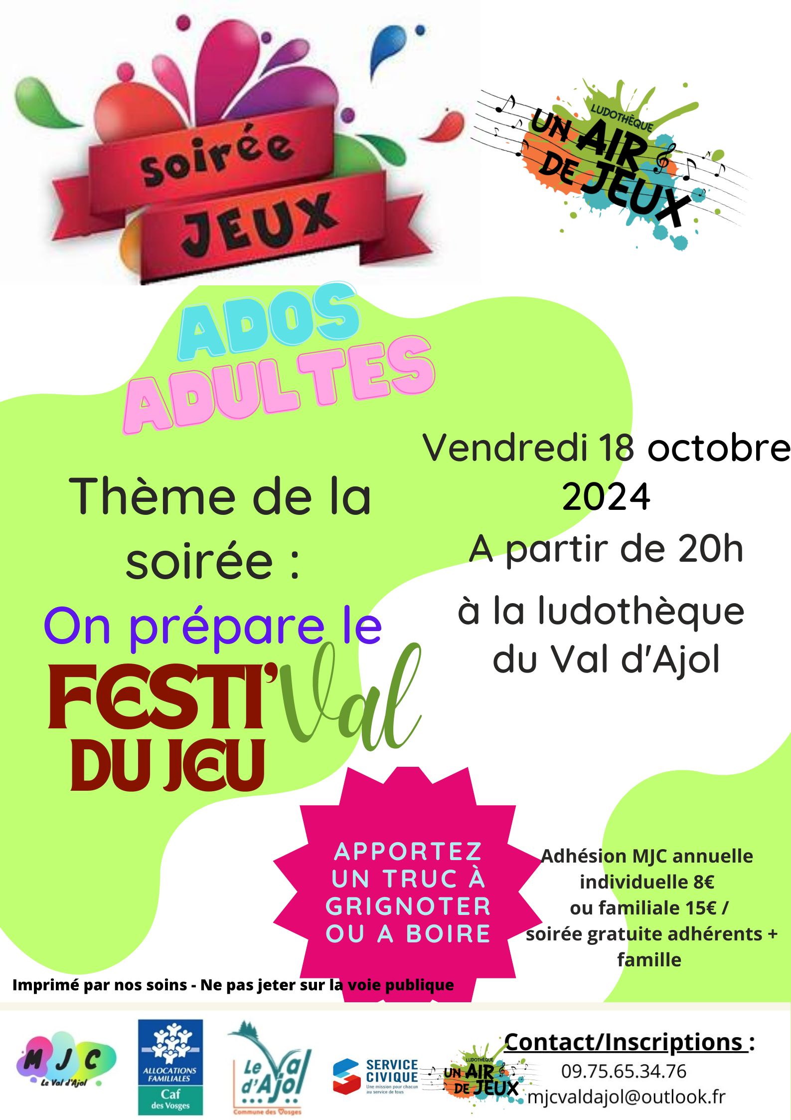 Soirée jeux ados-adultes, thème » On prépare le Festi’ Val du Jeu ». Vendredi 18 octobre 2024, à 20h, à la ludothèque « Un Air de jeux «