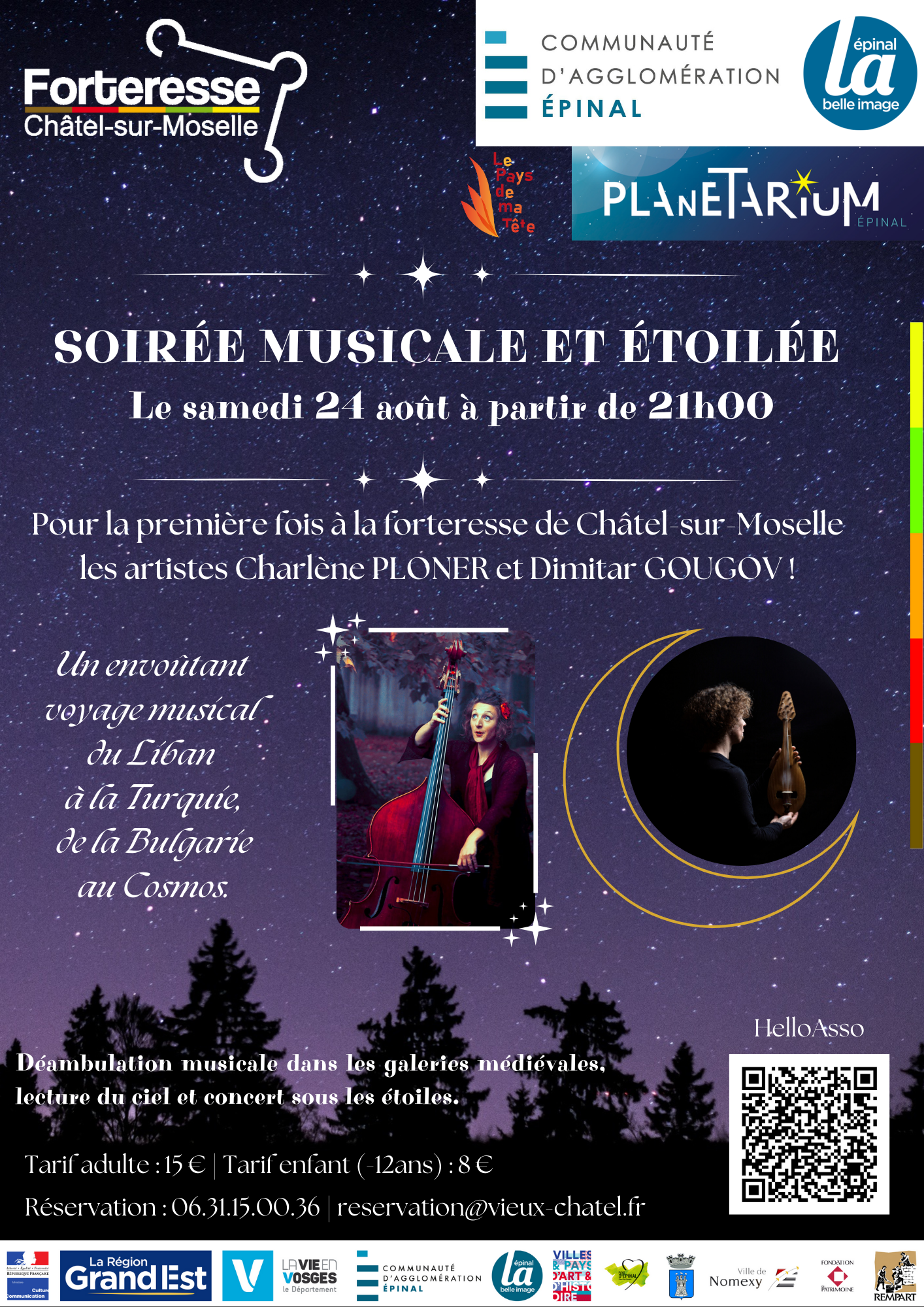 À la tombée de la nuit, déambulez dans les galeries, laissez vous guider par les mélodies de Charlène PLONER et Dimitar GOUGOV. Observez les étoiles et décelez leurs secrets avec le Planétarium d’Épinal. Profitez enfin du concert de Charlène et Dimitar pour vous évader dans un monde onirique, le temps d’un instant.