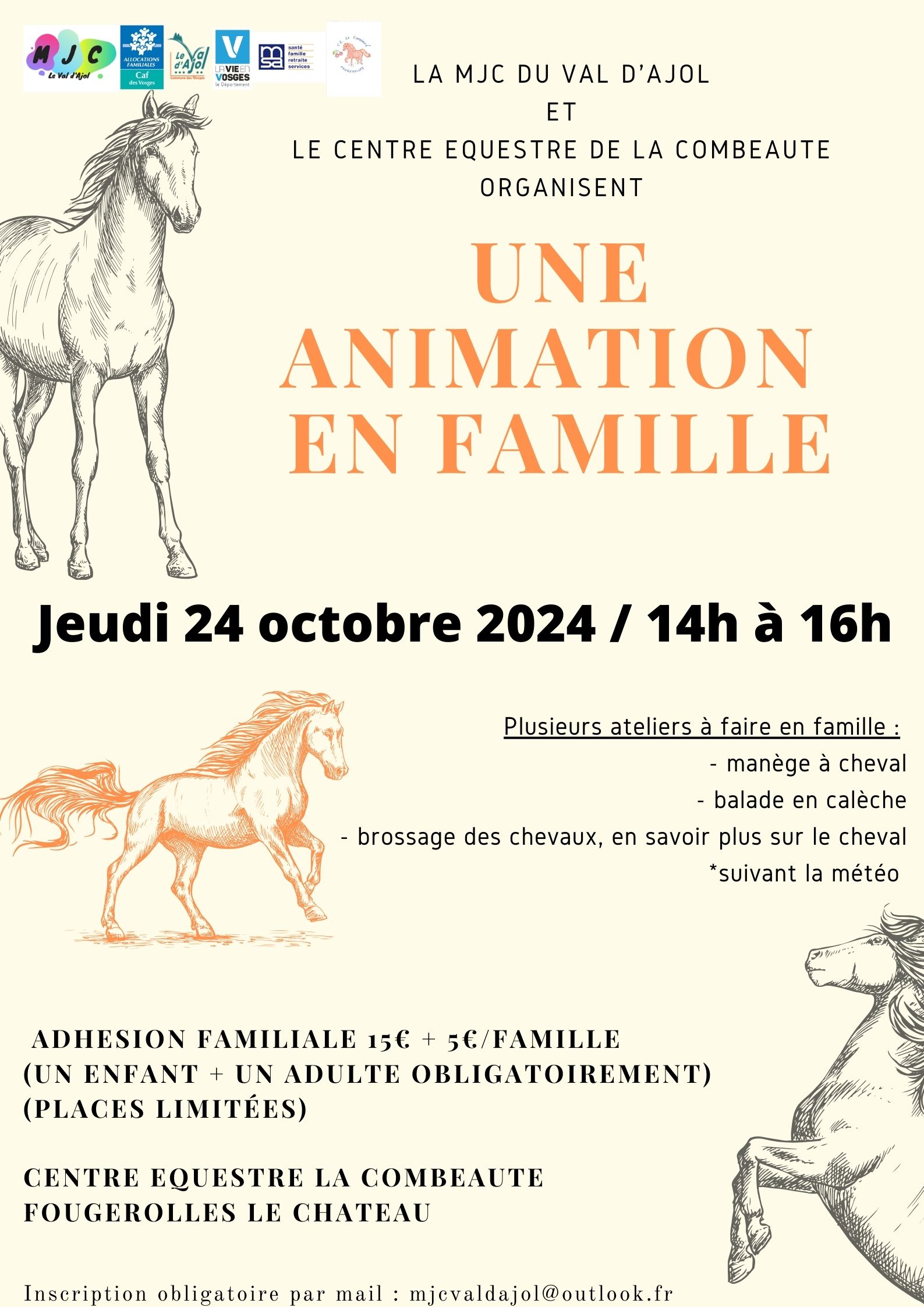 Sortie équitation en famille, le jeudi 24 octobre 2024, de 14h à 16h, au centre équestre la Combeauté (Fougerolles-Saint-Valbert).