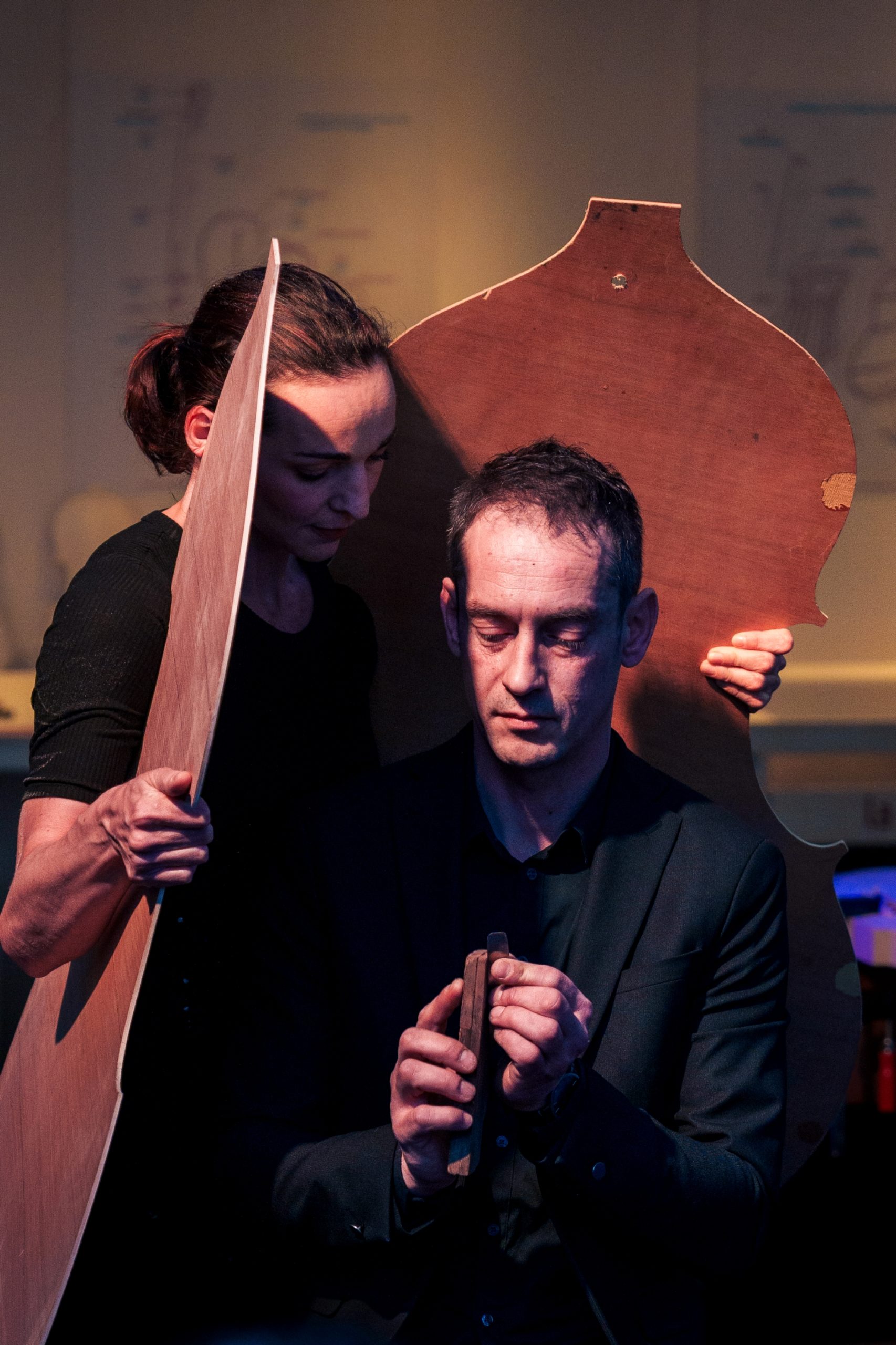 « Entre-deux » est une performance qui rassemble une danseuse et un luthier au milieu des instruments et des outils de l’atelier de lutherie : sur scène, le luthier travaille à son établi. Près de lui, la danseuse observe, s’inspire et se livre à une danse dont la seule musique est constituée par le son des outils. Peu à peu, des harmonies, des rythmes, des motifs se dessinent.