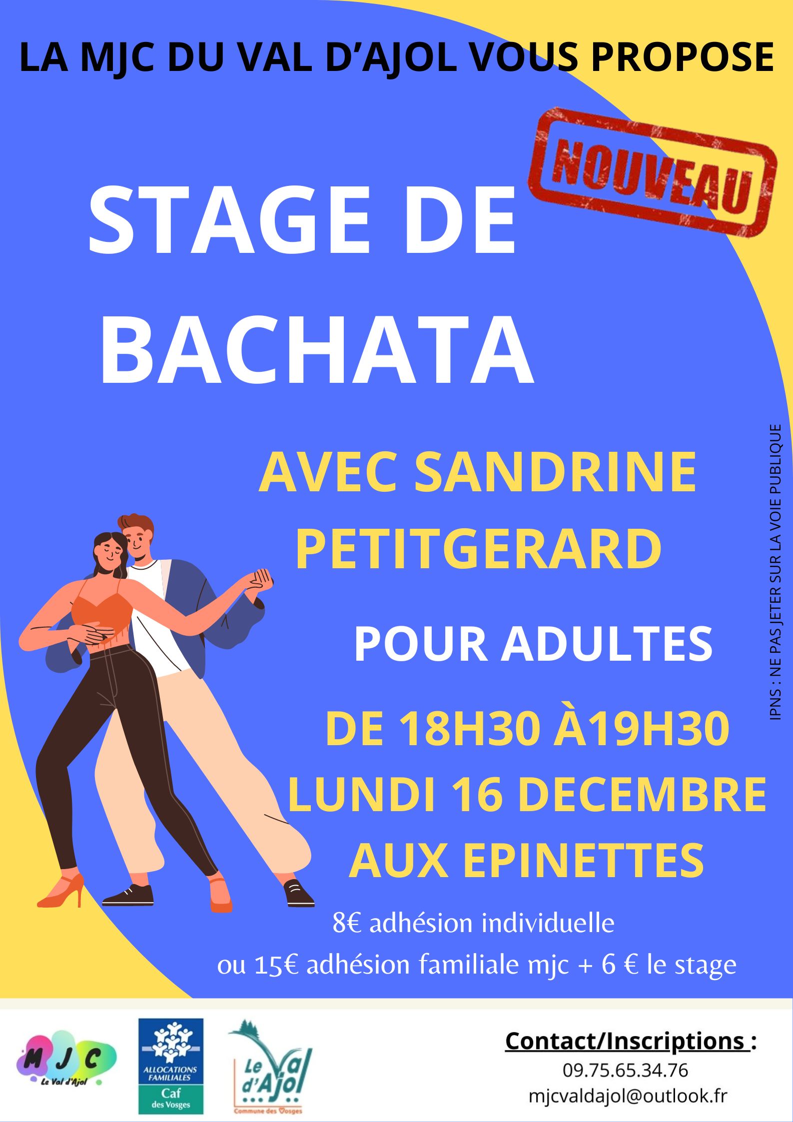 Envie de partager un moment à deux ou en solo ? La MJC du Val d’Ajol vous propose un stage de bachata. Le lundi 16 décembre 2024, de 18h30 à 19h30, aux Epinettes. Le Val d’Ajol. Avec Sandrine PETITGERARD.