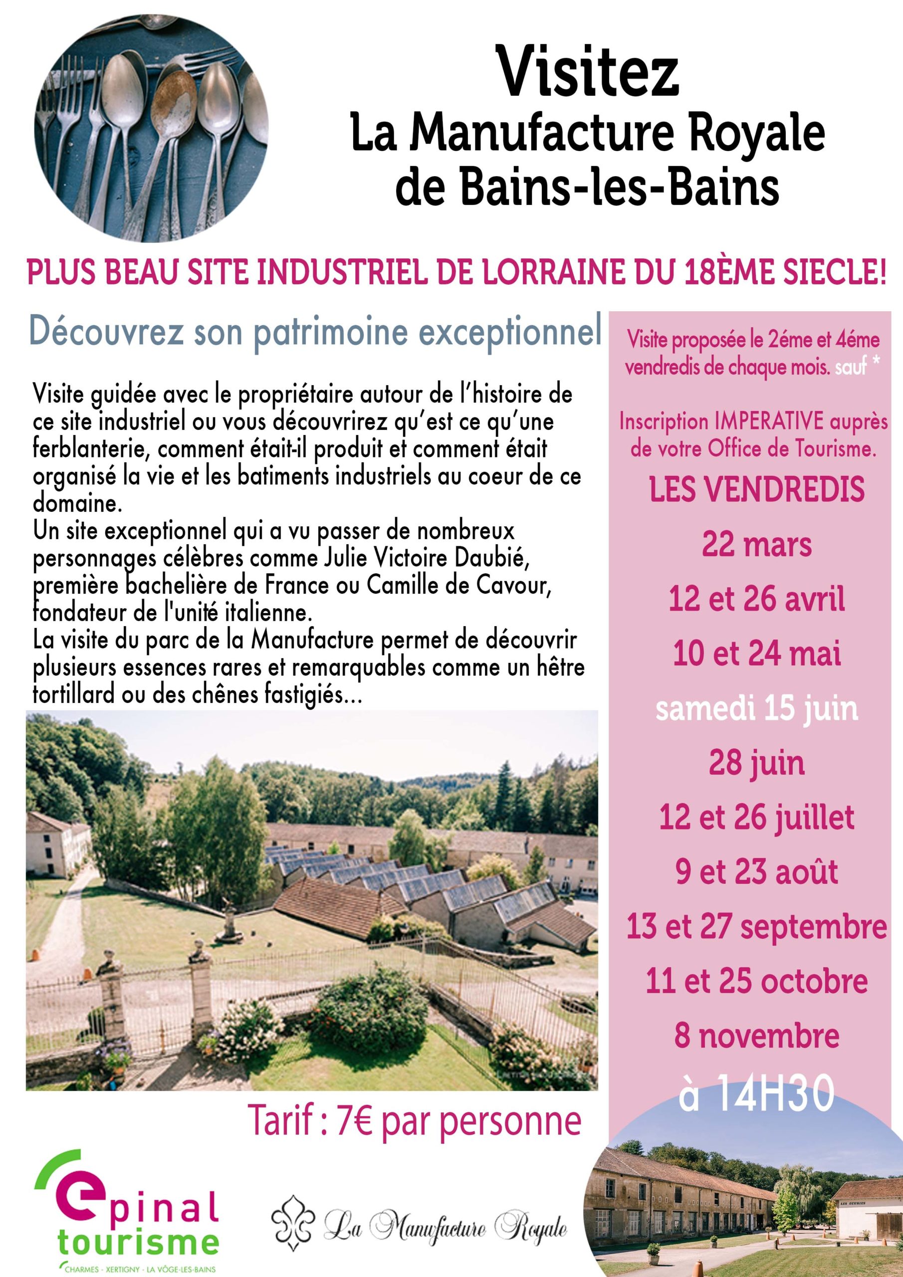 Visite guidée du plus beau site industriel de Lorraine du XVIIIe siècle avec son propriétaire qui vous contera l’histoire de ce site, des arbres du parc et des personnages qui l’ont marqué, dont Julie Victoire Daubié, Première bachelière de France qui y est née en 1824; Cavour, Fondateur de l’Unité italienne en 1839; Jules Méline fondateur du Mérite Agricole et créateur de la banque du même nom . La visite du parc de la Manufacture permet de découvrir le fameux hêtre tortillard, arbre de l’année à l’Unesco, et les essences rares qui témoignent du riche passé industriel du domaine (Ginko Biloba, catalpa, tulipier de Virginie).