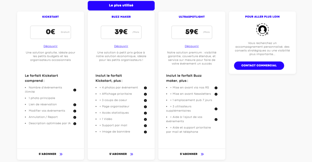 - Freemium : Envie d’aller plus loin ? Accédez à des options supplémentaires comme la promotion en tête de liste d’événements, des rapports de performance détaillés, et des outils de communication dédiés pour maximiser l’impact de vos actions